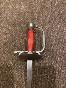 Given the pandemic, I have not had a chance to fence with the sword so this is an impression article rather than a review. I love the feel and balance. The large screw-on pommel keeps the weight in the hand making the blade feel almost weightless. The tip is flared (something that is hard to determine on the Castille website) and the blade has excellent flex when I stab my pell. I did stain the wood handle red as I found the default color to be a bit boring, but that is personal preference. The hilt is sturdy and has no rattle. A leather washer between the handle and the pommel controls vibration and keeps the entire sword tight.