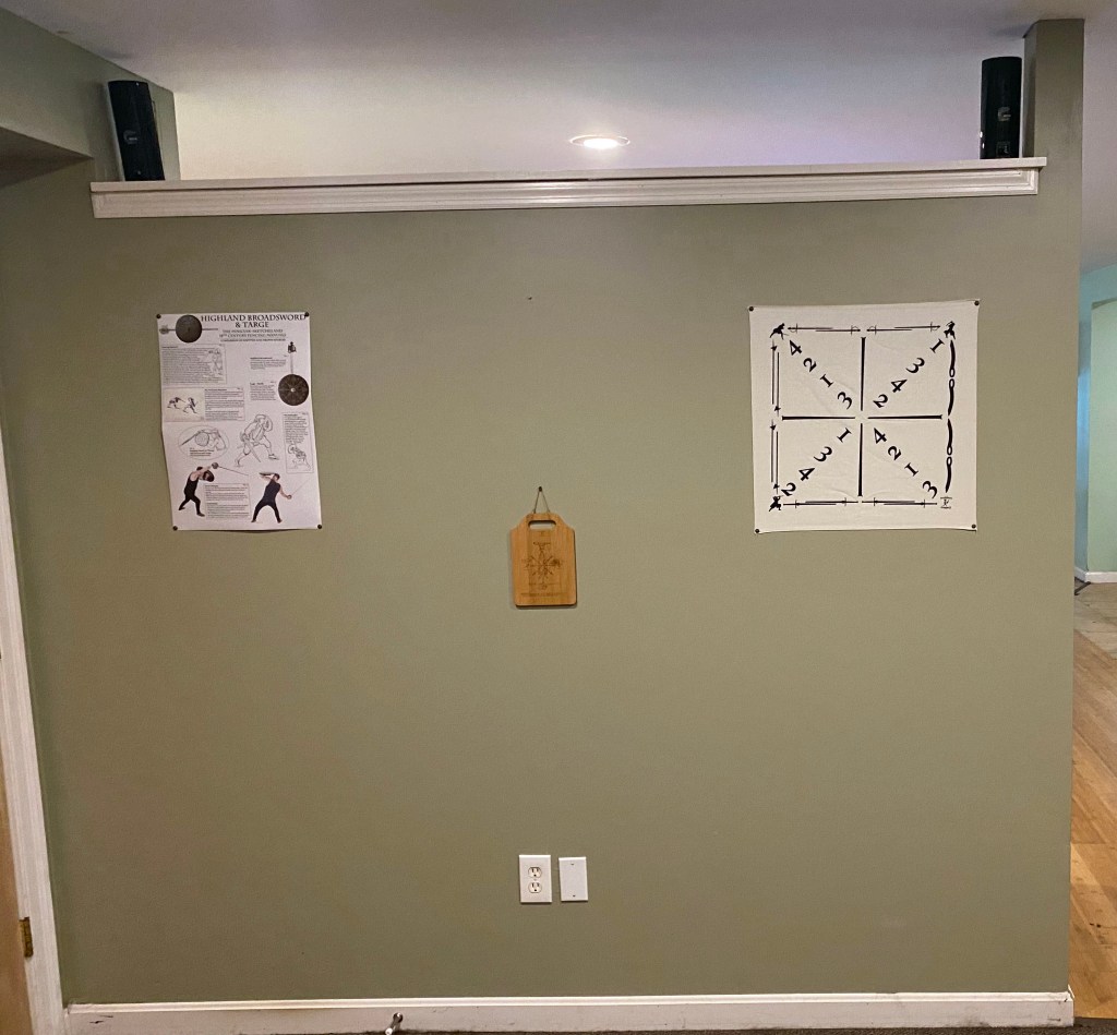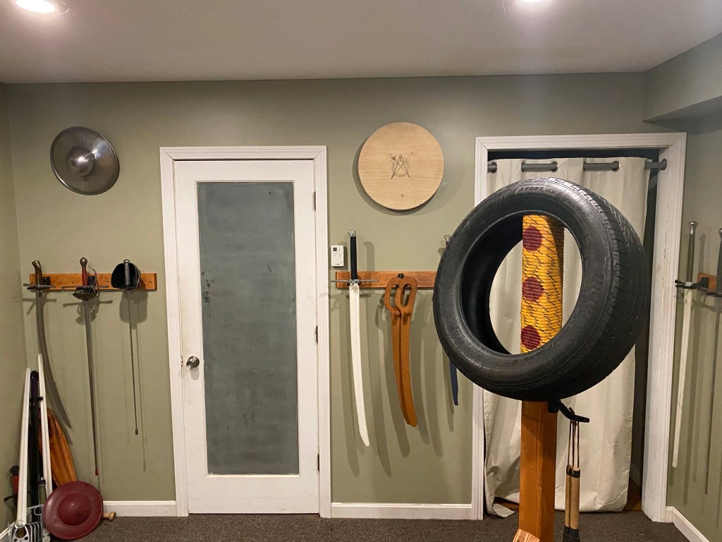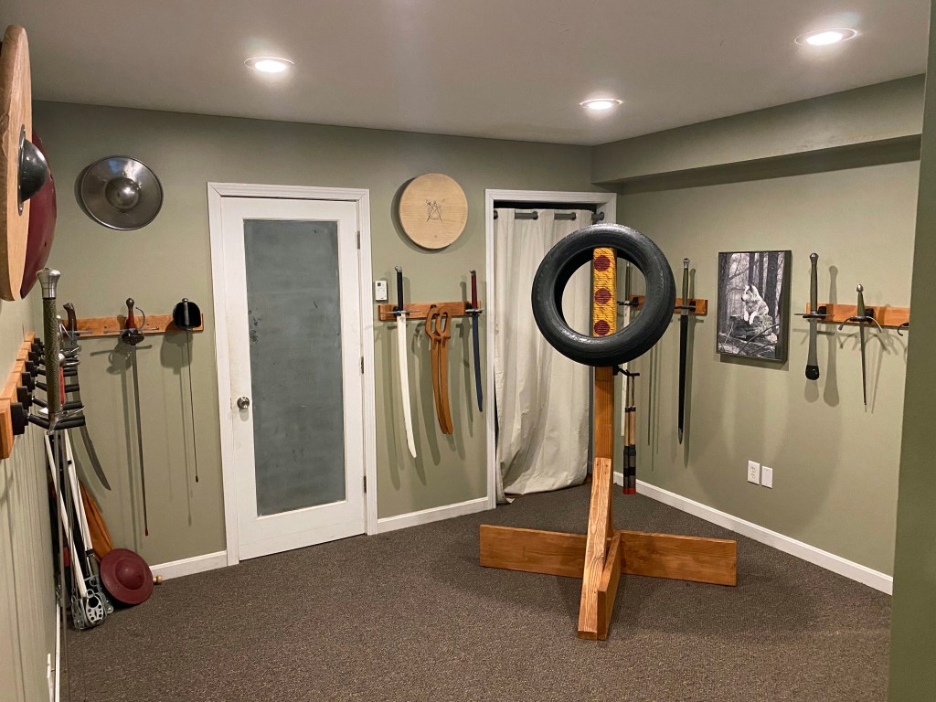 Home practice can make all the difference for advancing HEMA skills. Adding a pell (the thing in the photos with the tire on it) allows me to practice cuts and thrusts in my own time between classes. The downside of a pell is that it takes up a fair amount of space. So, if I am going to dedicate a room to my pell, why not dedicate the whole room to my wonderful HEMA hobby! It took some convincing with the wife, but I am very happy with the result.