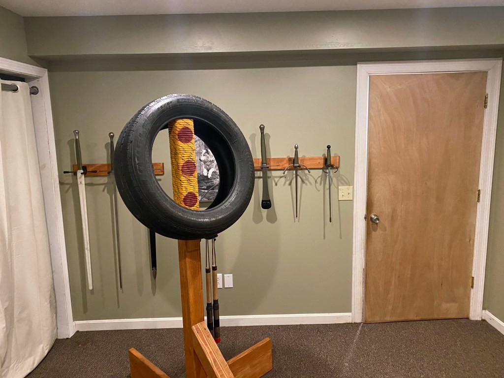 If you have the space available, the cost is very low to build out your own HEMA room. The pell is simply a 4×4, some 2x8s, rope, and an old tire. I used some spray paint and a masking tape roll to put the thrusting target circles on the center post. Other than that, you need some 1x3s, the guitar hangers, and some time. Be warned, once you have a place to hang multiple swords, you will feel the need to fill those spaces so the cost could go up in the end!